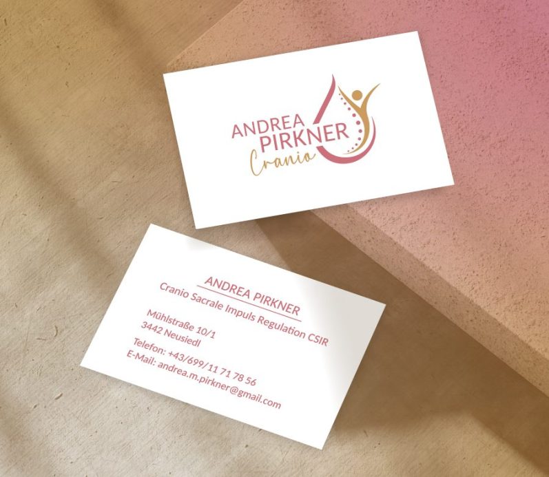 Für Andrea Pirkner wurde ein Logo entworfen, das den Körper und das Element Wasser in einer Tropfenform vereint und mit ansprechenden, warmen Farben umgesetzt. Zusätzlich wurden Visitenkarten mit dem neuen Logo gestaltet.